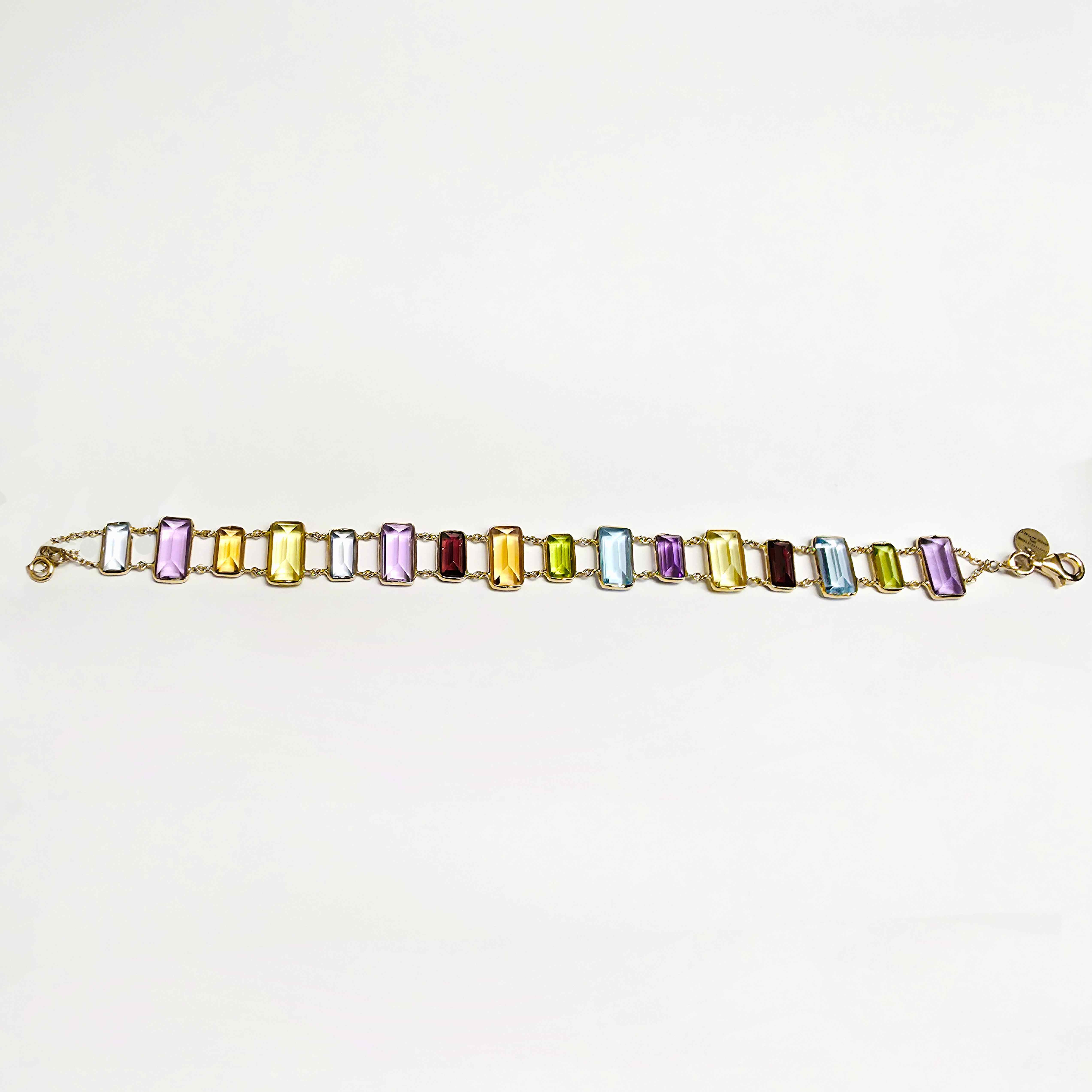Prachtige gouden armband met verschillende kleuren edelsteen.