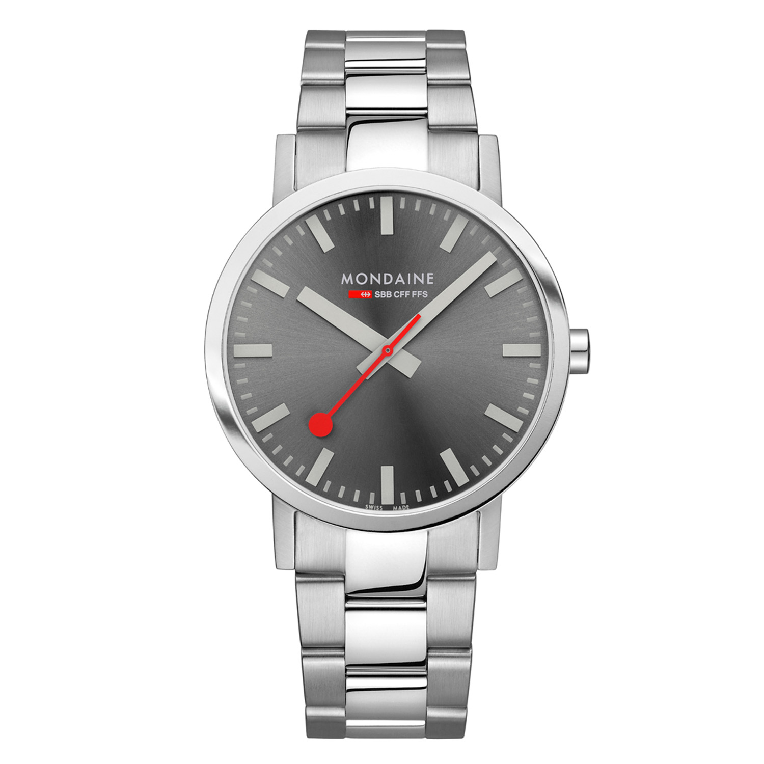 Dit design horloge uit de Mondaine Classic serie heeft een geborsteld horlogekastje van 40mm met een grijze sunray geborstelde wijzerplaat met een witte uursaanduiding. Aan het ronde horlogekastje zit een mat glanzende stalen schakelband met een vouwsluiting. Het horloge heeft vlak krasvast saffierglas en is 5ATM. Het Swiss Railway horloge heeft een zwitsers precisie quarts uurwerk. Opvallend is de rode secondewijzer. Maak een statement met dit verfijnde en klassieke uurwerk!