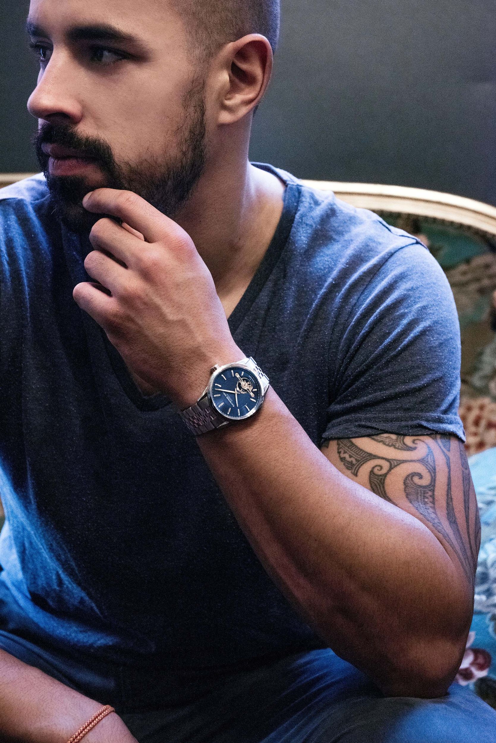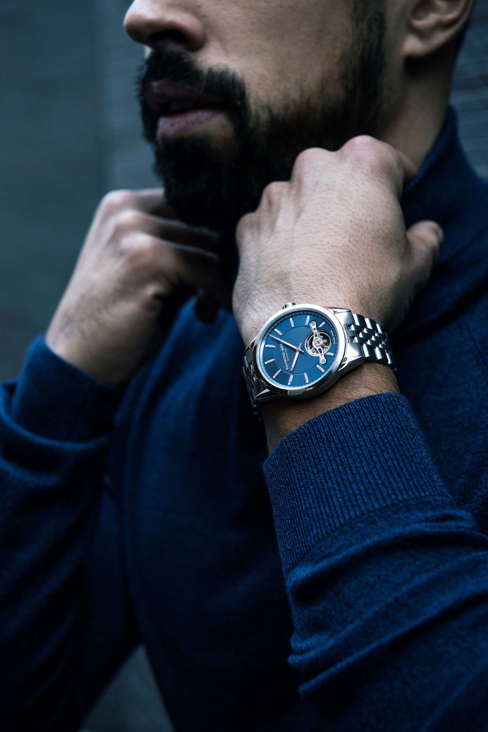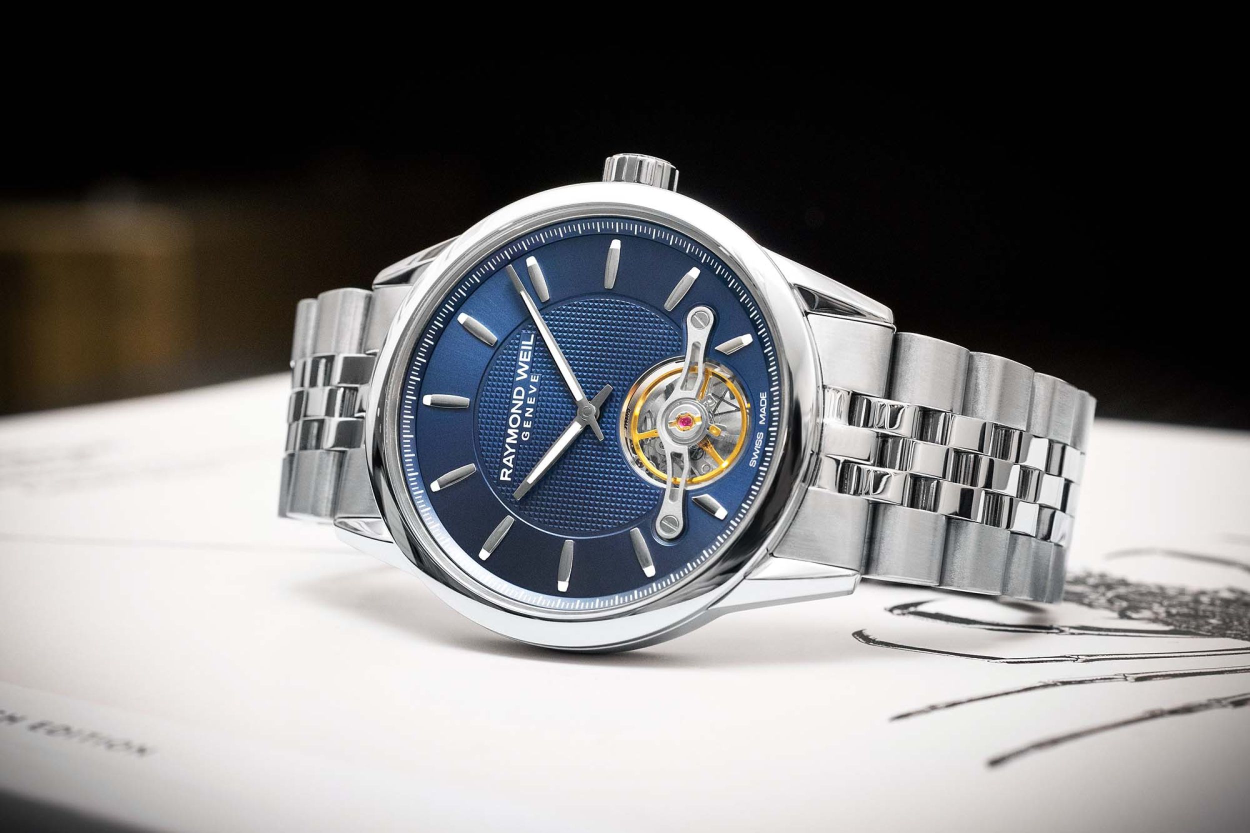 Dit Freelancer Calibre RW1212-model heeft een elegante roestvrijstalen kast van 42 mm en een verfijnde blauwe wijzerplaat met zilveren indexen. Het wordt met name gekenmerkt door het zelfopwindende mechanische uurwerk, ontworpen in samenwerking met Sellita, dat klopt met een frequentie van 28.000 trillingen per uur en een gangreserve heeft van 41 uur. Het diamantgeslepen balanswiel en de opengewerkte bruggen onthullen het hart van het horloge.