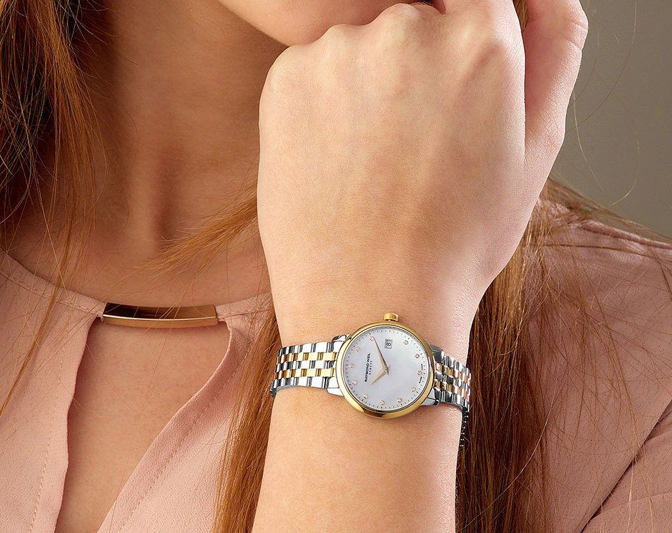 Dit elegante dameshorloge  van Raymond Weil uit de Toccata serie is 29 mm in doorsnee en slechts 7 mm dik.