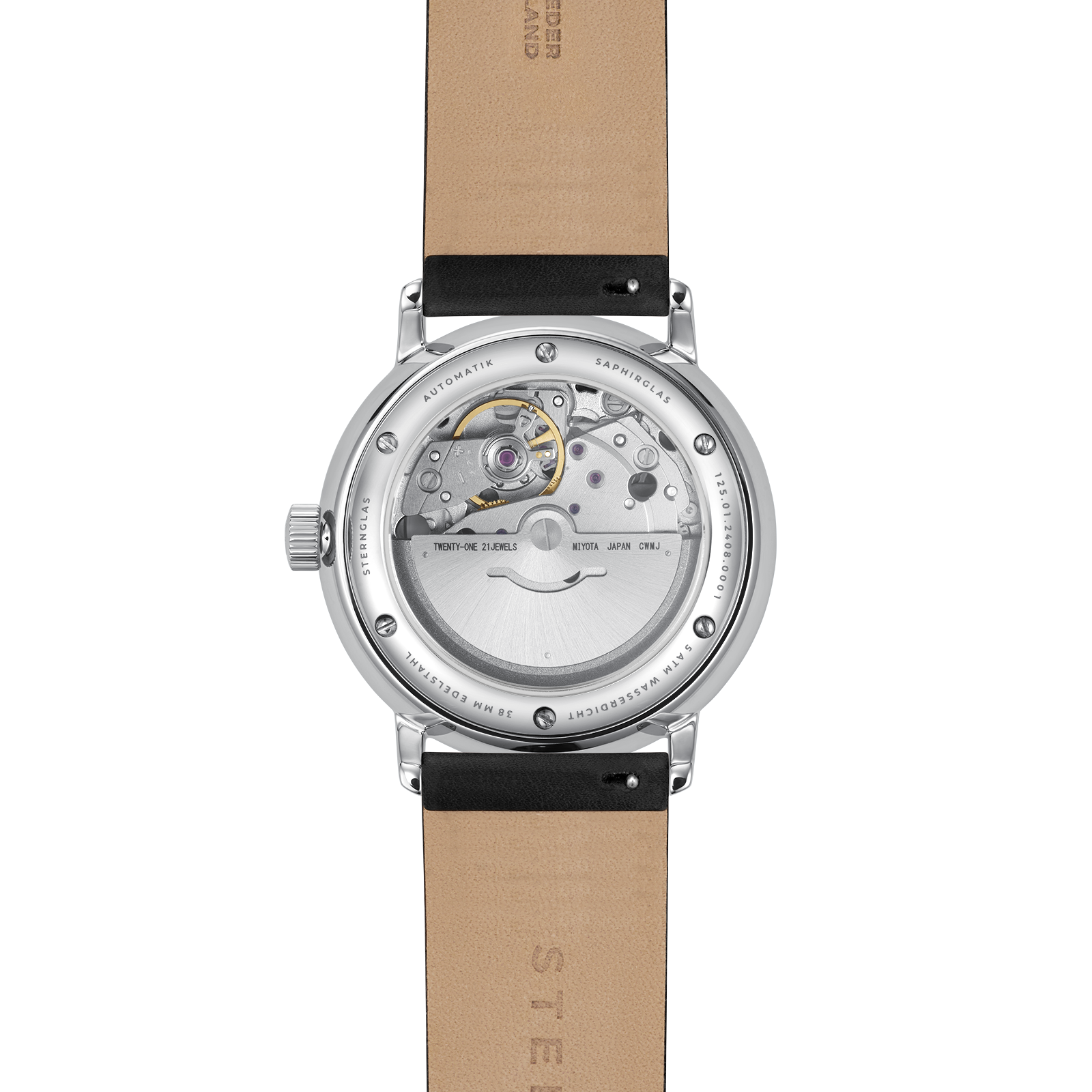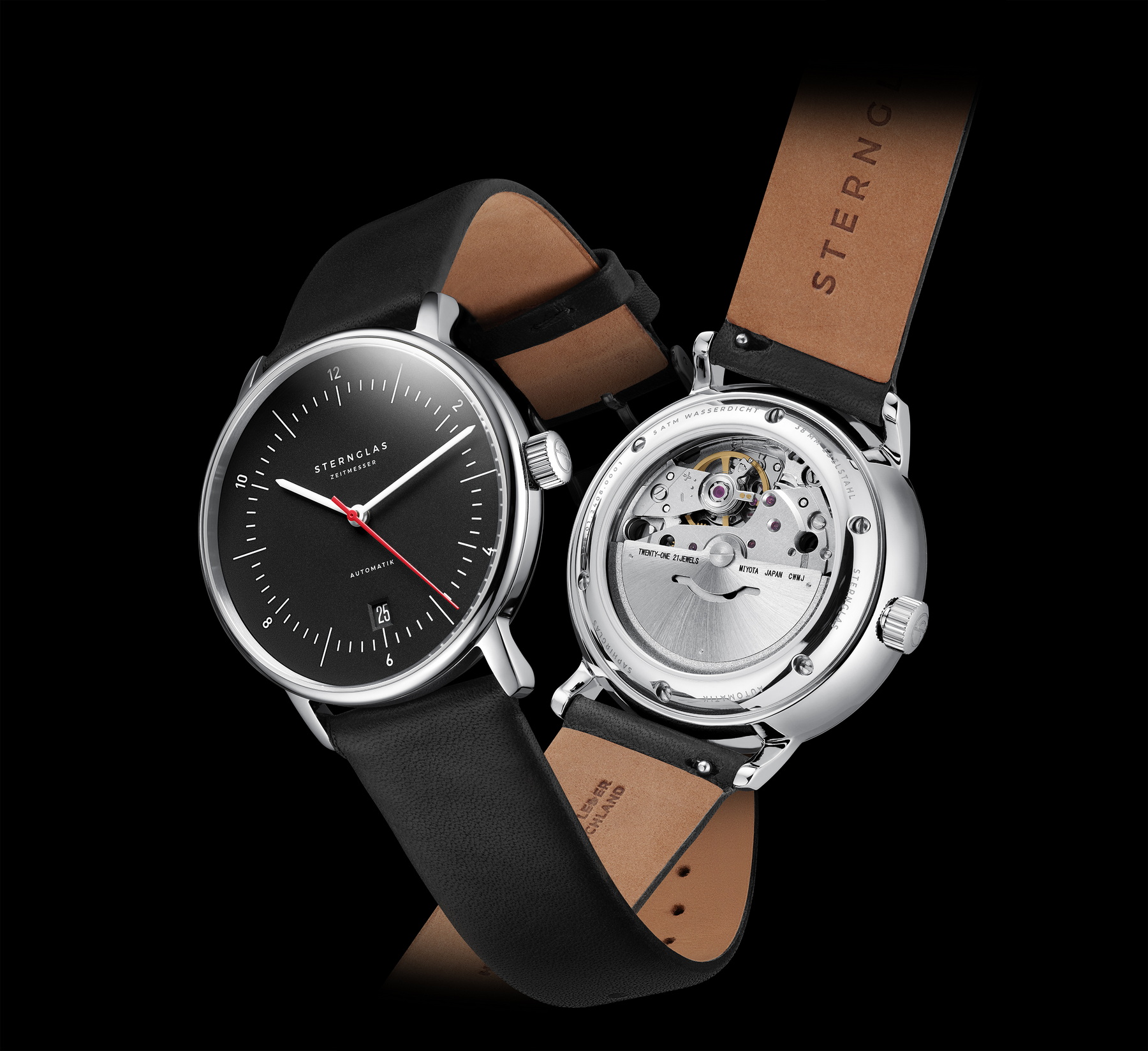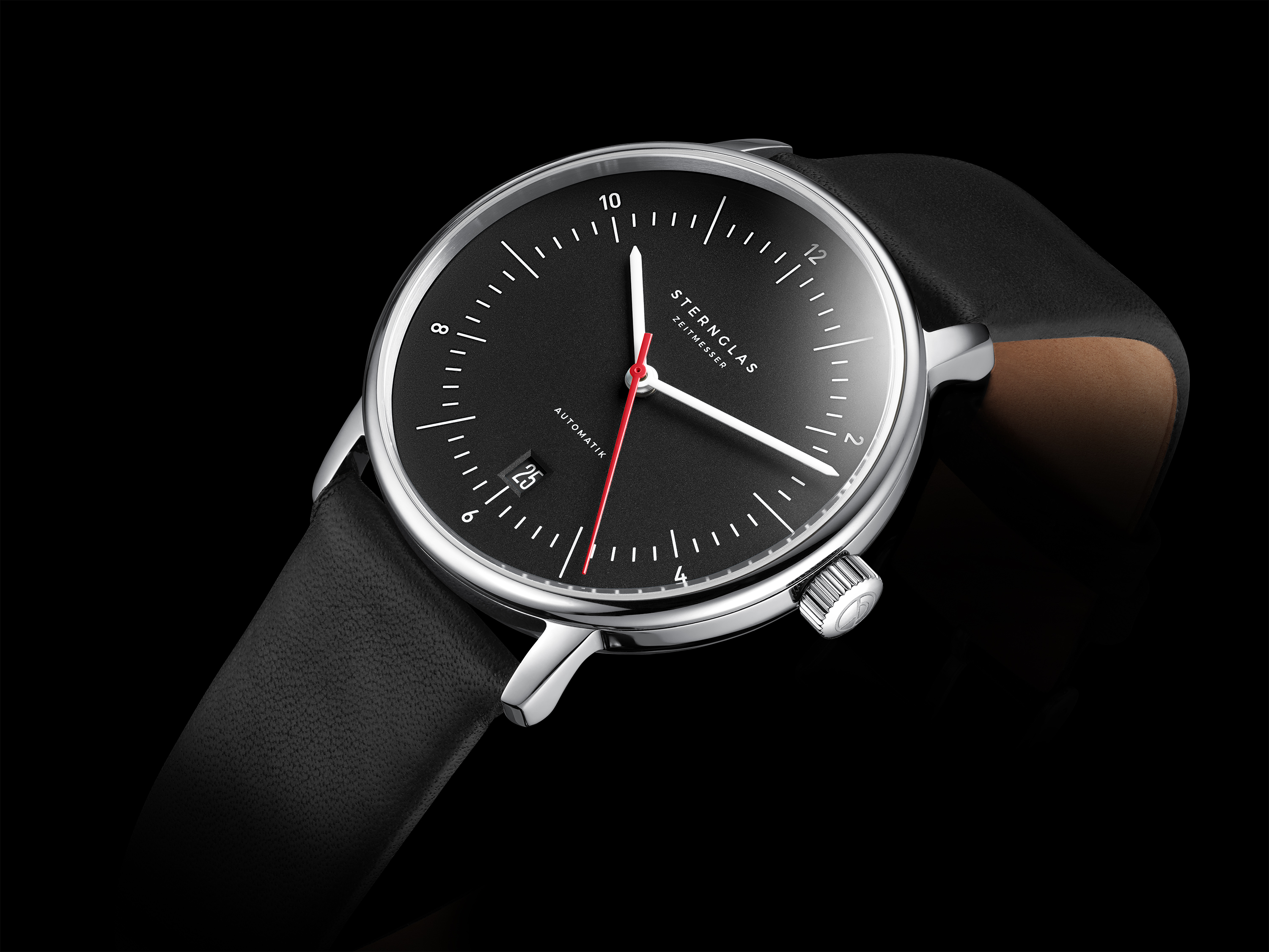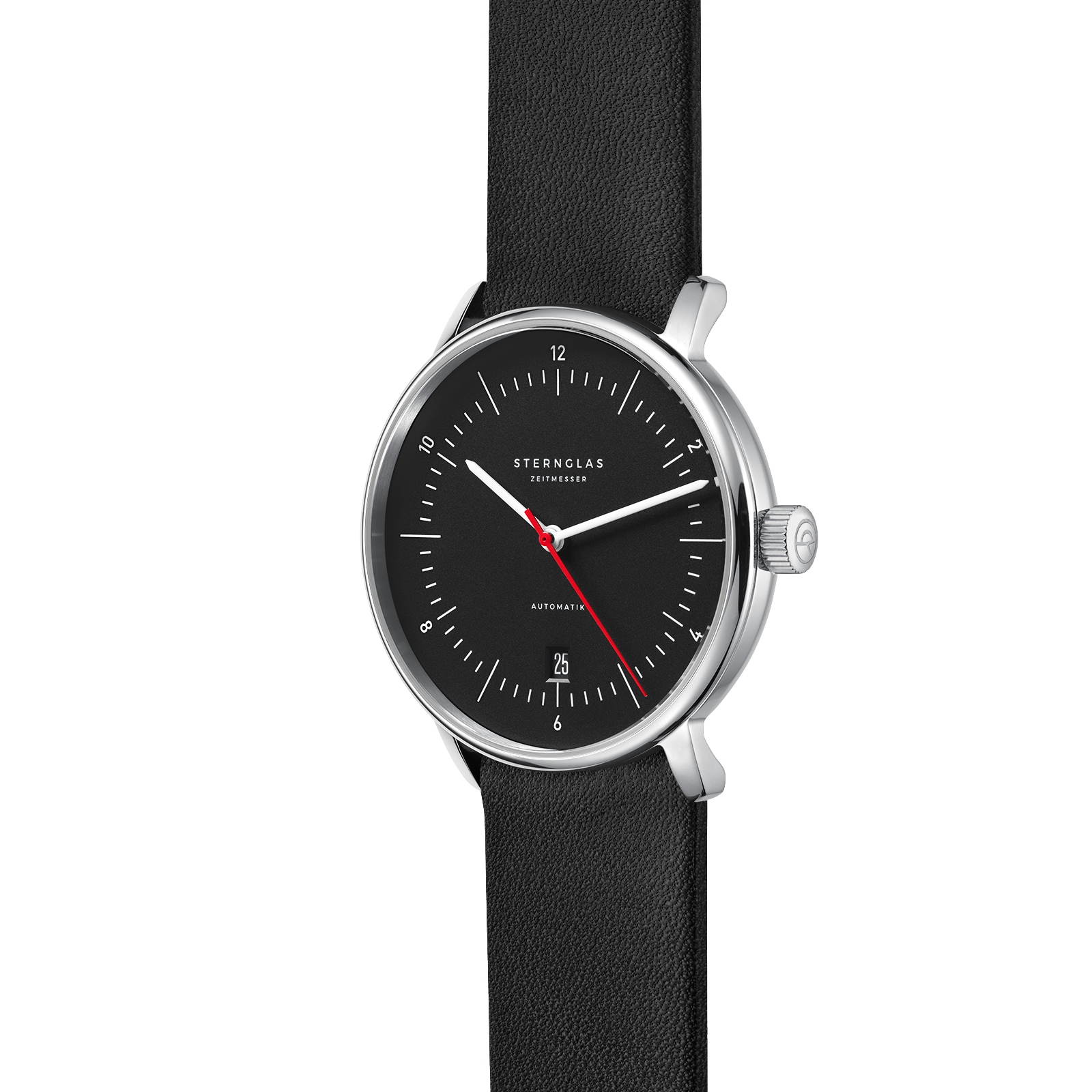 Automaat met zwarte wijzerplaat en rode secondewijzer als accent, zwart leren band.